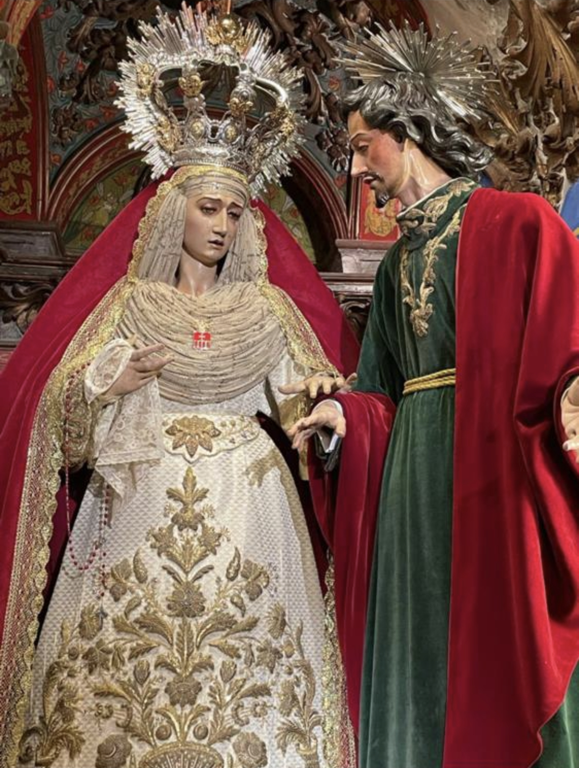Así luce María Santísima del Desconsuelo, ya preparada para la festividad de San Mateo junto a San Juan Evangelista.