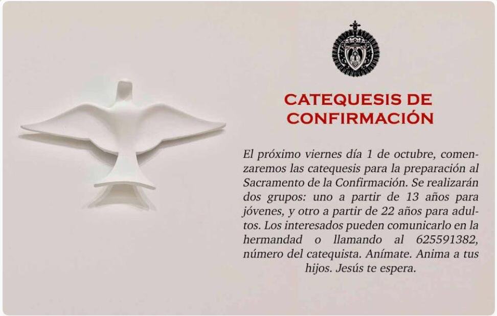 El próximo día 1 de Octubre, comenzarán las catequesis para la preparación del Sacramento de la Confirmación. Si quieres formar parte de este curso ponte en contacto con la Hermandad.
