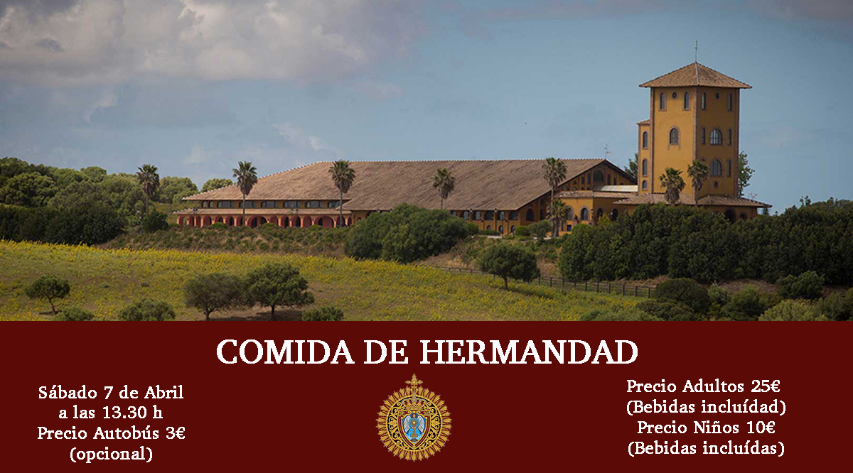 El próximo sábado 7 de abril tendrá lugar en la finca Fuente Rey, la comida que organiza nuestra Hermandad a las 13.30 h. La comida estará precedida por una eucaristía de Acción de Gracias a nuestros Sagrados Titulares por la pasada Estación de penitencia. El precio de la comida es de 25€ para los adultos y de 10€ para los niños, las bebidas vienen incluidas en el precio. La Hermandad dispondrá de un autobús para todo aquel que quiera desplazarse en el , el precio del autobús es de 3€ y se puede reservar hasta el jueves 5 de abril.