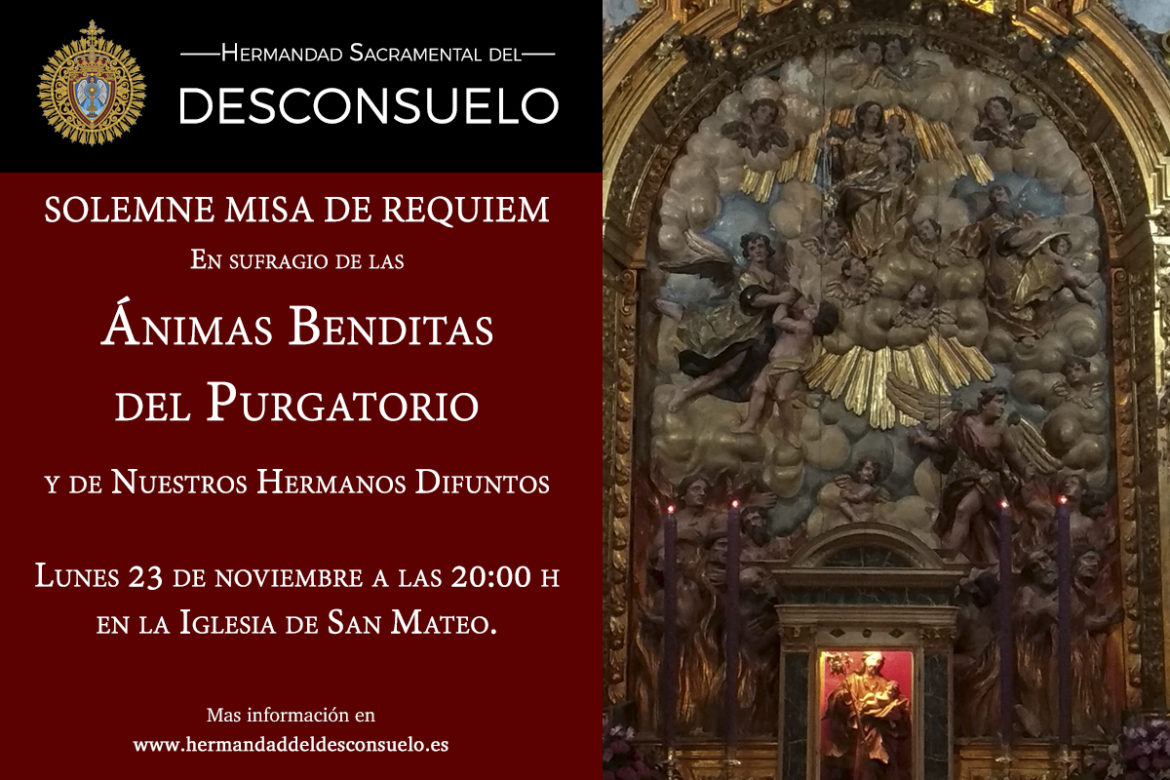 Tal y como mandan las reglas de nuestra Hermandad, la Eucaristía del lunes 23 de noviembre se aplicará por el eterno descanso de nuestros Hermanos difuntos, que ya gozan de la presencia del Padre. así como por la salvación y purificación de las Ánimas Benditas del Purgatorio. La Eucaristía se celebrará a las 20:00h en la Iglesia de San Mateo.