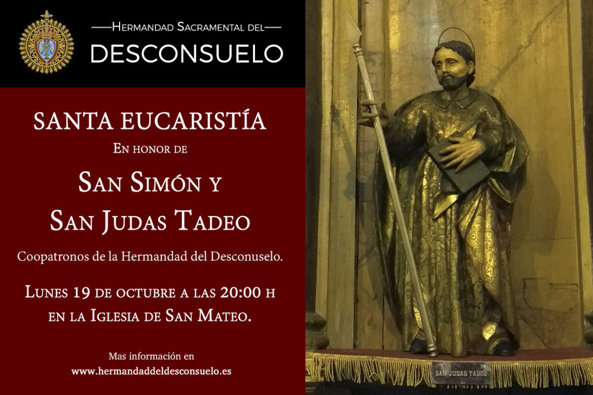 La Hermandad del Desconsuelo celebrará el lunes 19 de octubre, Eucaristía en honor a los Santos Apóstoles Simón y Judas Tadeo, Coopatronos de la Hermandad. La Santa Eucaristía comenzará a las 20:00 h en la Iglesia de San Mateo, al término se rezarán las preces en la capilla del Señor de las Penas, que es donde se encuentran las sagradas imágenes.