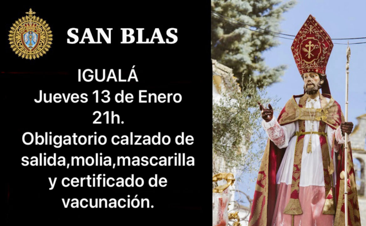 El próximo 13 de enero de 2022 a las 21:00 horas tendrá lugar en la casa de hermandad, la igualá de la cuadrilla de nuestro Patrón San Blas, si las medidas sanitarias impuestas a esa fecha lo permiten.