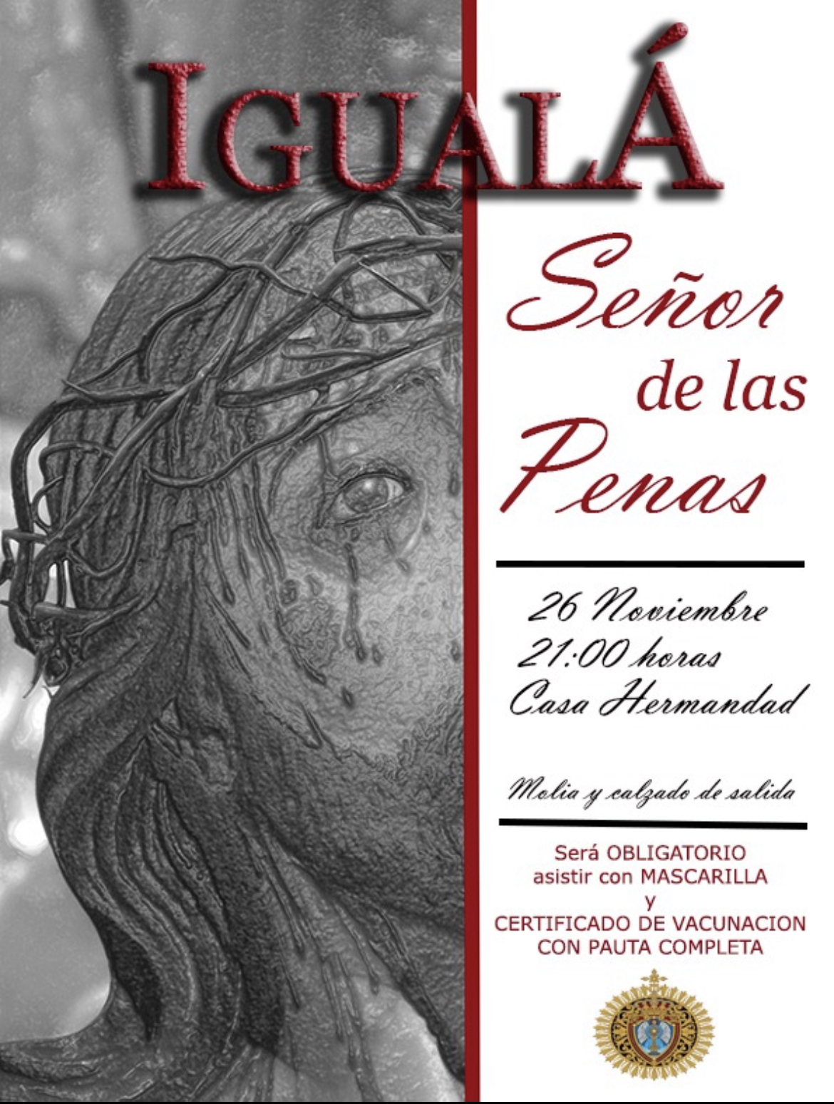 El próximo viernes 26 de noviembre las 21:00 horas en la Casa de Hermandad, se llevará a cabo la igualá de la Cuadrilla de Nuestro Padre y Señor de las Penas. Es imprescindible para ser igualado asistir con calzado de salida y molía.