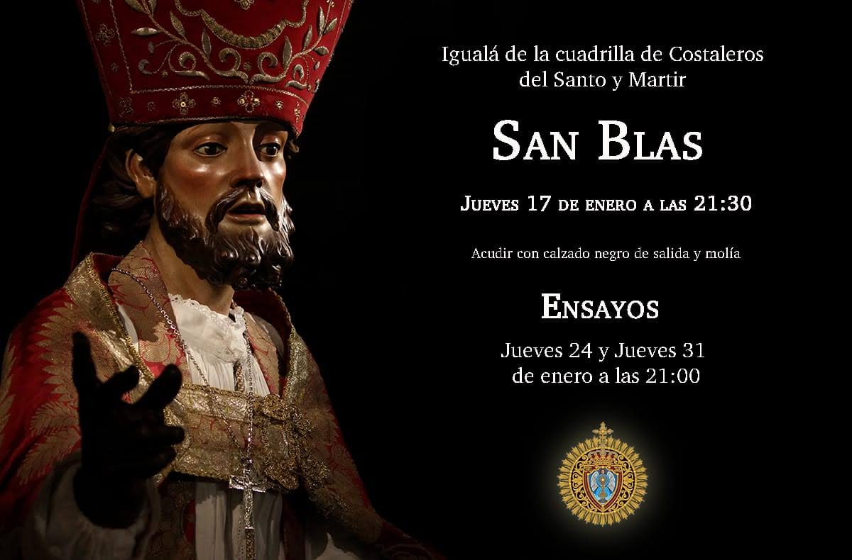 El próximo 17 de enero a las 21:30 tendrá lugar en la Iglesia de San Mateo la igualá del Mártir San Blas, Patrón de la curación de los males de garganta. Es imprescindible acudir con molía y calzado negro de salida.