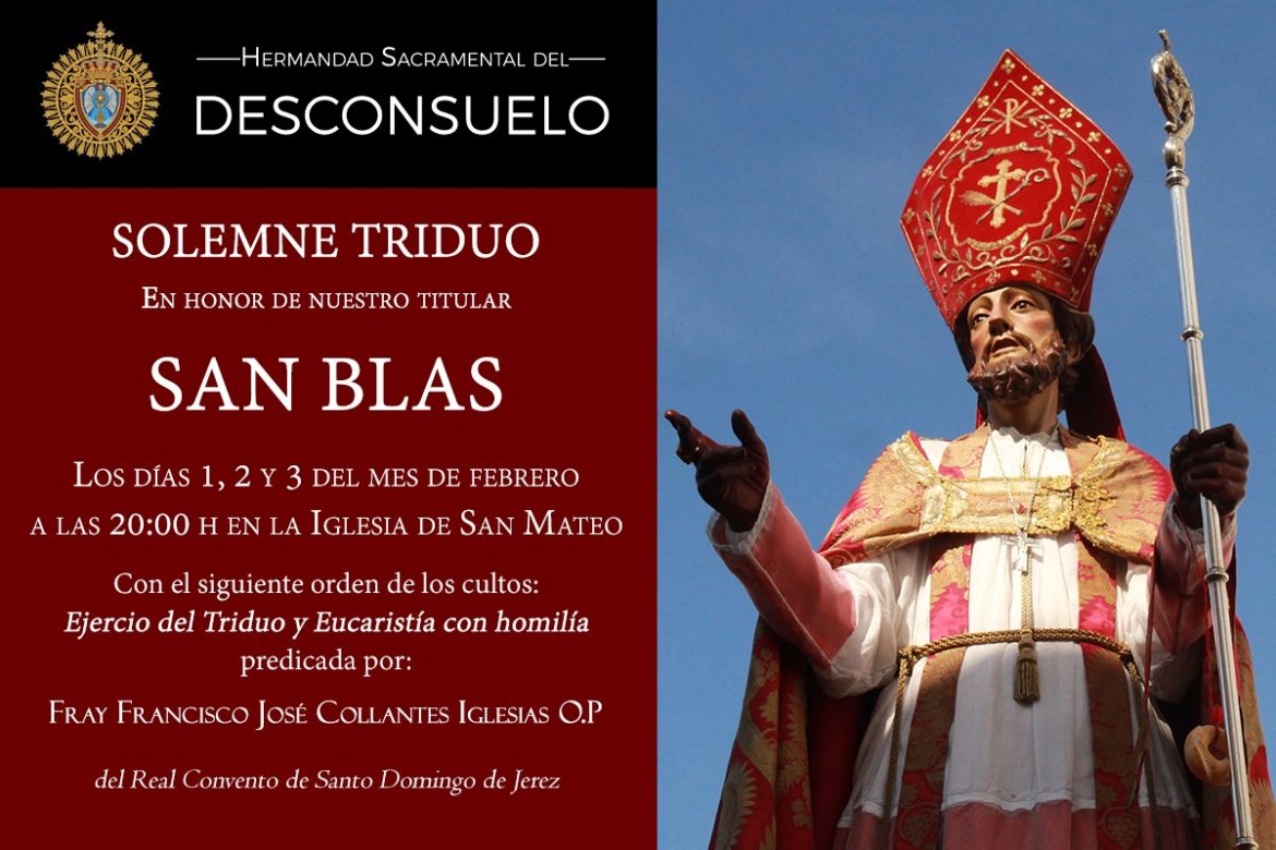 Los días 1, 2 y 3 del mes de Febrero de 2023 a las 20:00 horas en la Iglesia de San Mateo, se celebrará el Solemne Triduo en honor a nuestro Patrón San Blas, este será predicado por Fray José Collantes Iglesias O.P. del Real Convento de Santo Domingo de Jerez de la Frontera.