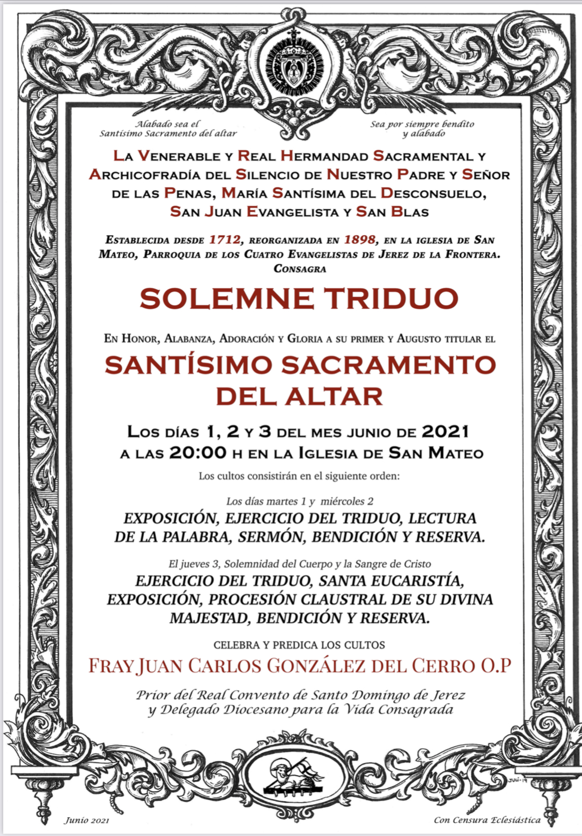 Solemne Triduo Eucarístico en honor al Santísimo Sacramento del Altar.