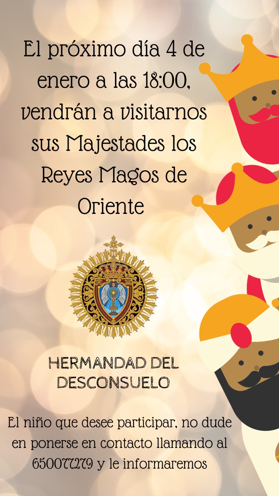 El día 4 de enero la Hermandad del Desconsuelo celebrará la venida de los Reyes Magos. Será a las 18.00h en la Iglesia de San Mateo. Se realizará para todos los pequeños de la Hermandad.