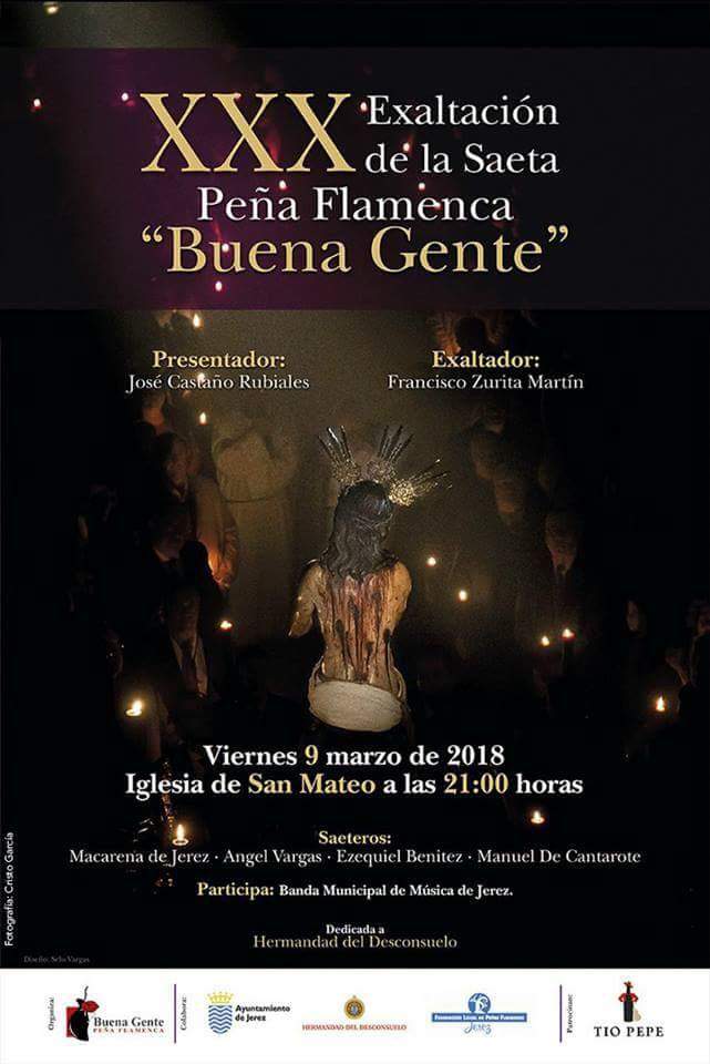 El próximo viernes día 9 a las 21:00 se celebrará en la Iglesia de San Mateo la XXX edición de la Exaltación a la Saeta. Este año 2018, está dedicada a la Hermandad del Desconsuelo contando como exaltador para esta ocasión con nuestro Hermano Mayor, Don Francisco J. Zurita Martín, siendo su presentador Don José Castaño Rubiales. La exaltación contará con las actuaciones de Macarena de Jerez, Angel Vargas, Ezequiel Benítez y Manuel de Cantarote. La Agrupación Musical la Clemencia de Jerez amenizará musicalmente dicho acto.